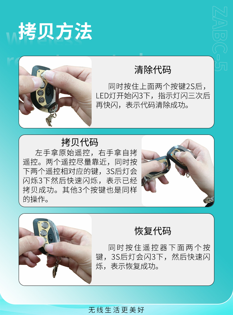 1、本遙控器是百萬組碼遙控器,不是自拷貝型的,隻能與學習功能的接收設備配套使用。