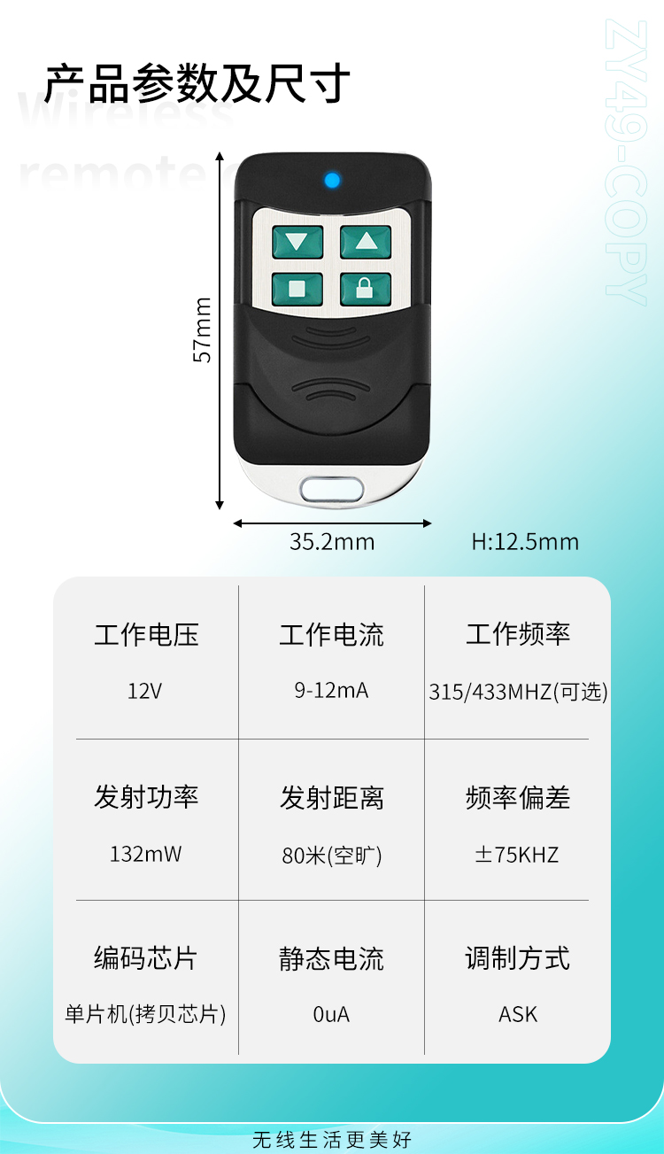 ZY49-COPY是一款拷貝型丝瓜视频下载污遙控器,滑蓋設計,具有可靠性高、頻率穩定、穿透能力強等特點;