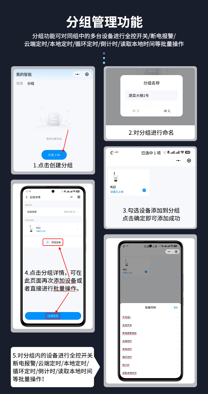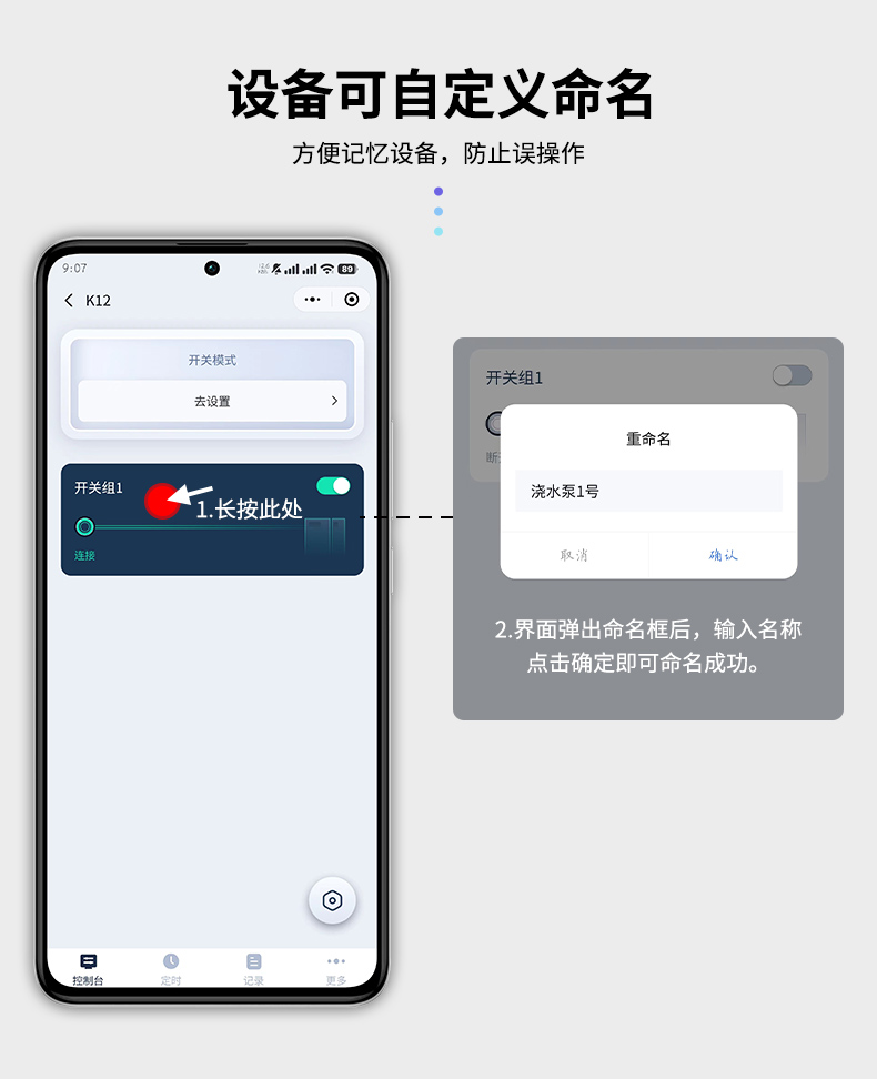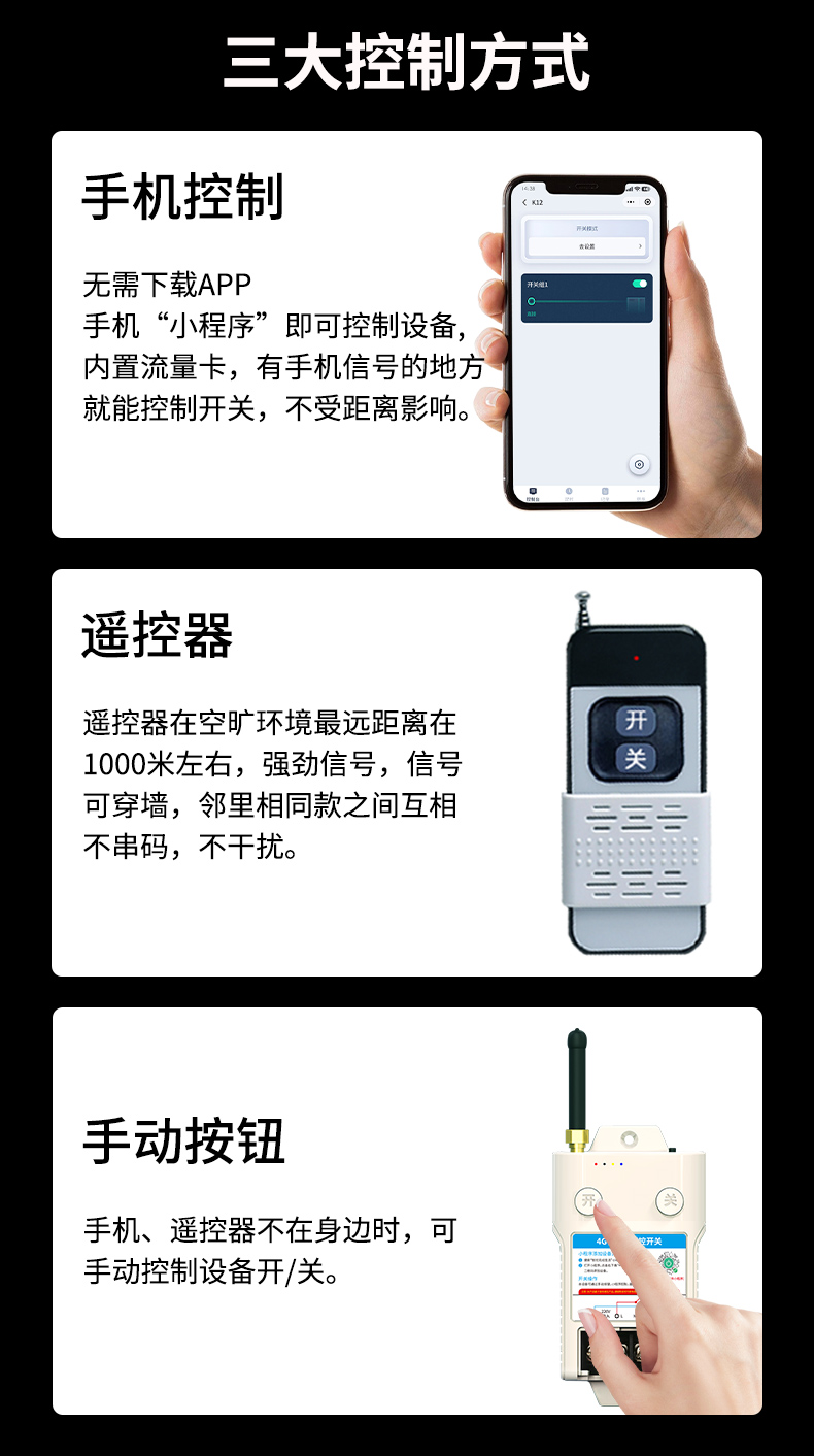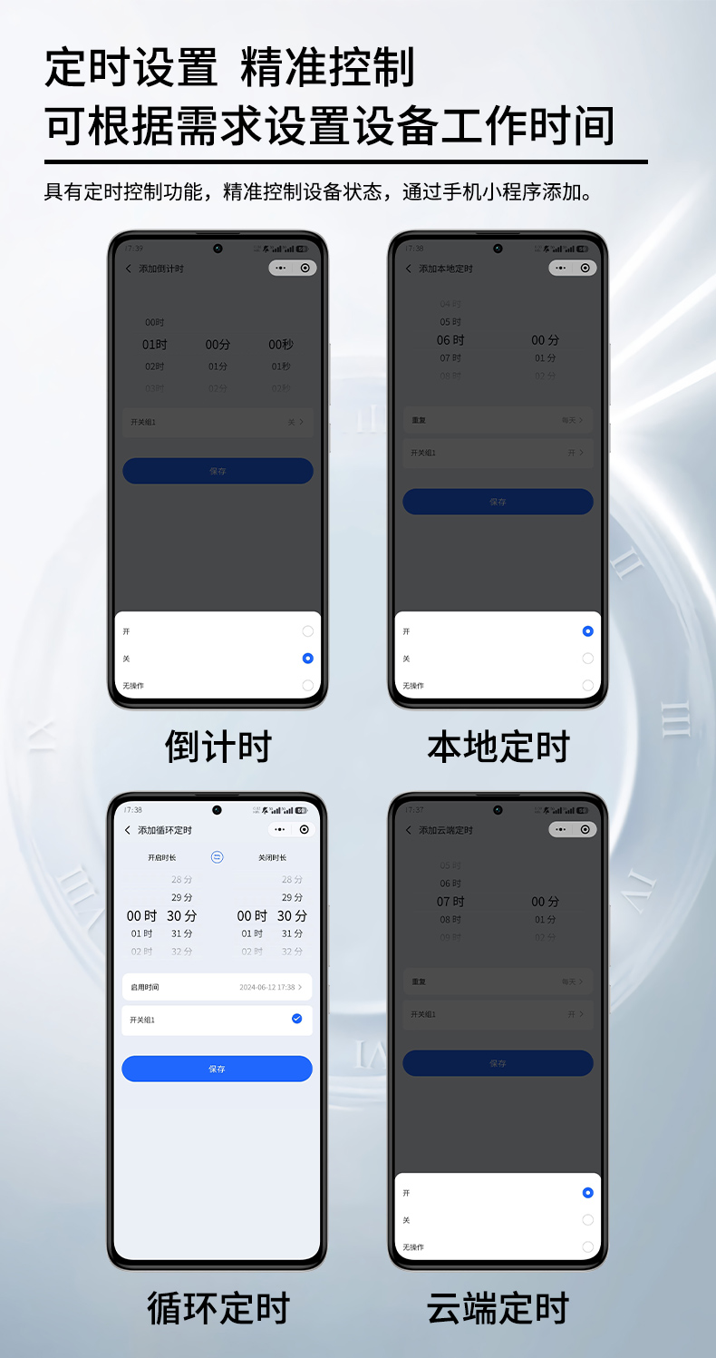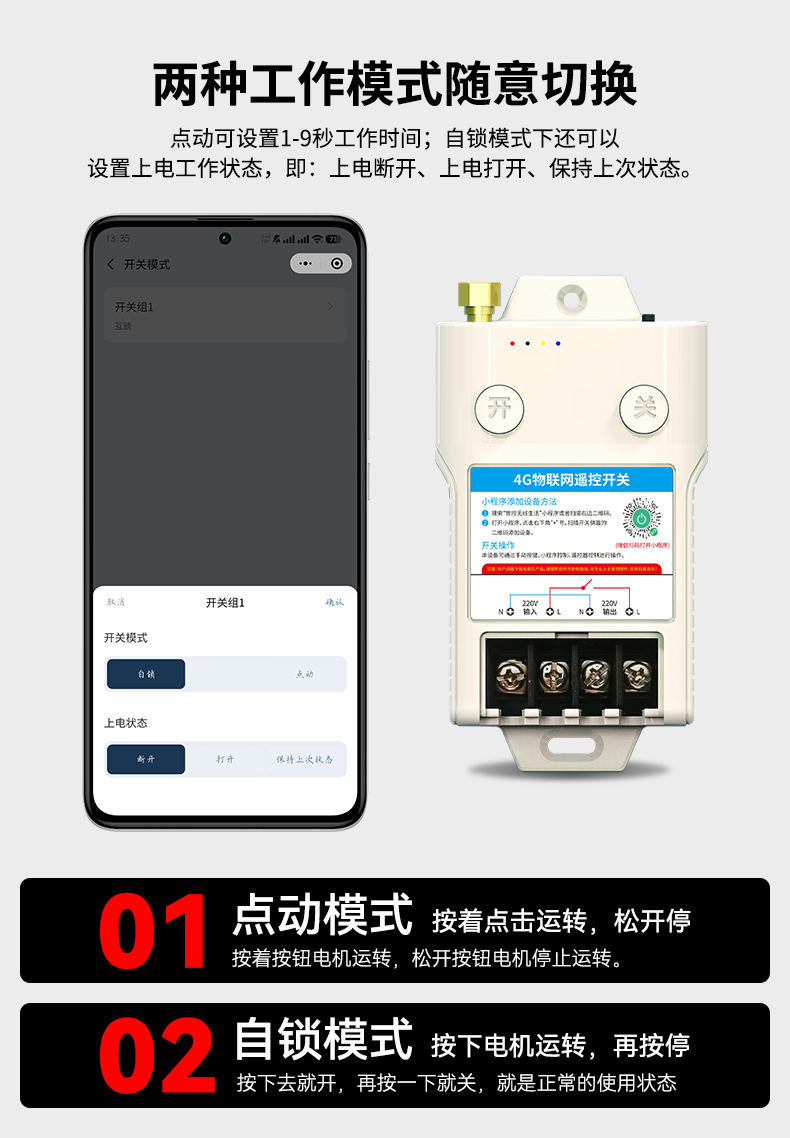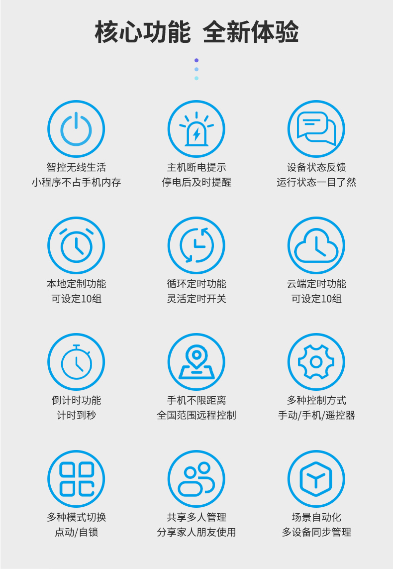 K12是一款單路智能遙控開關,手機微信小程序即可遠程控製開關,不限距離,四種定時模式,精準把控工作時間
