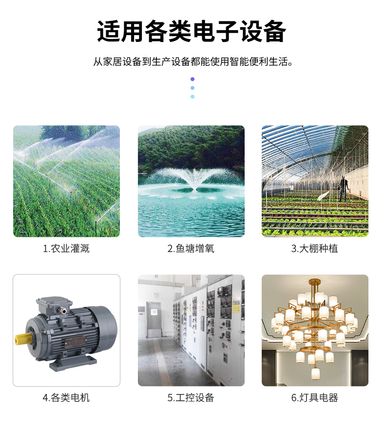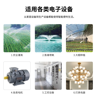 農業灌溉、魚塘增氧、大棚種植、各類電機、工控設備、燈具電器