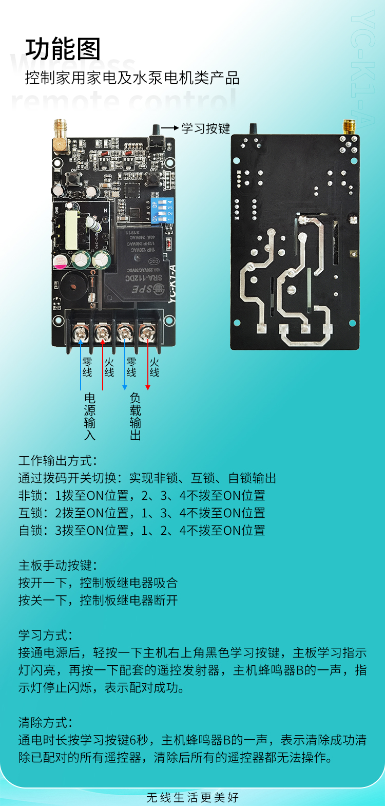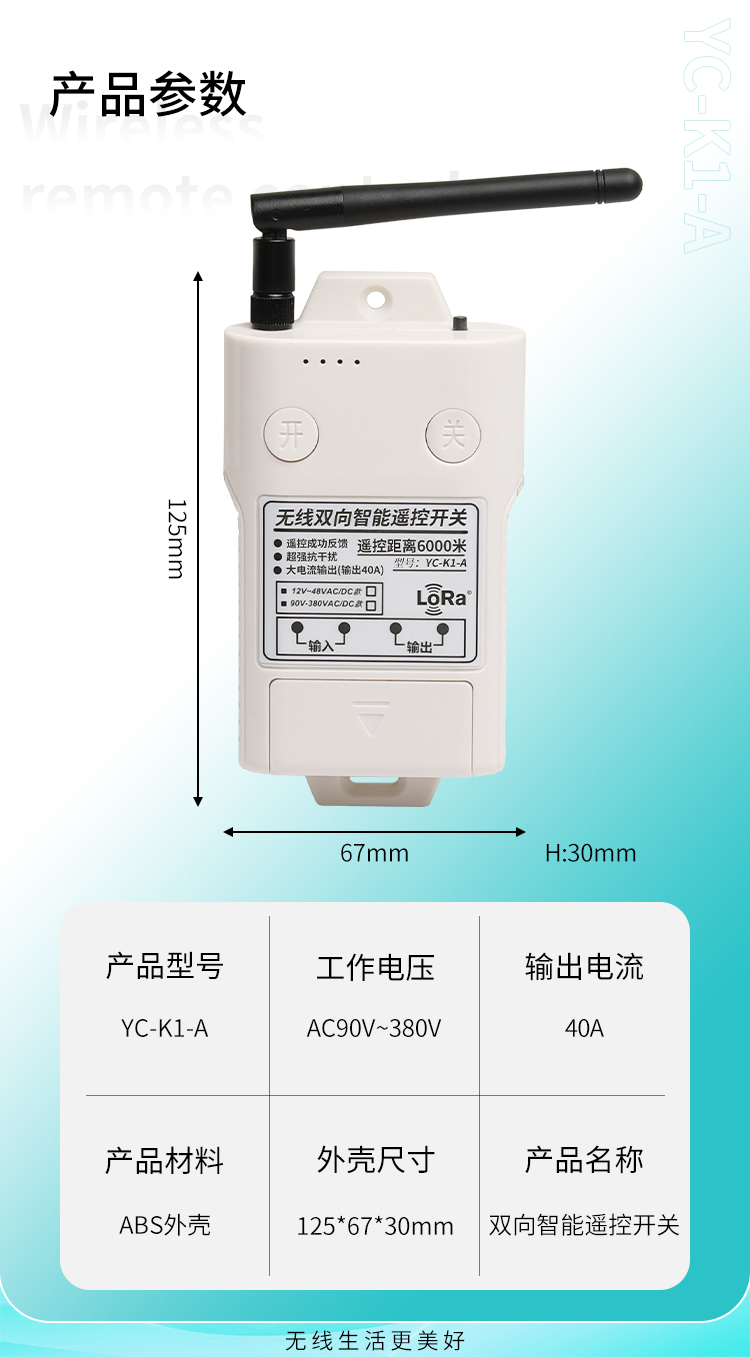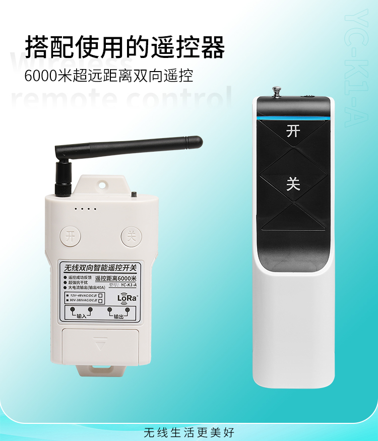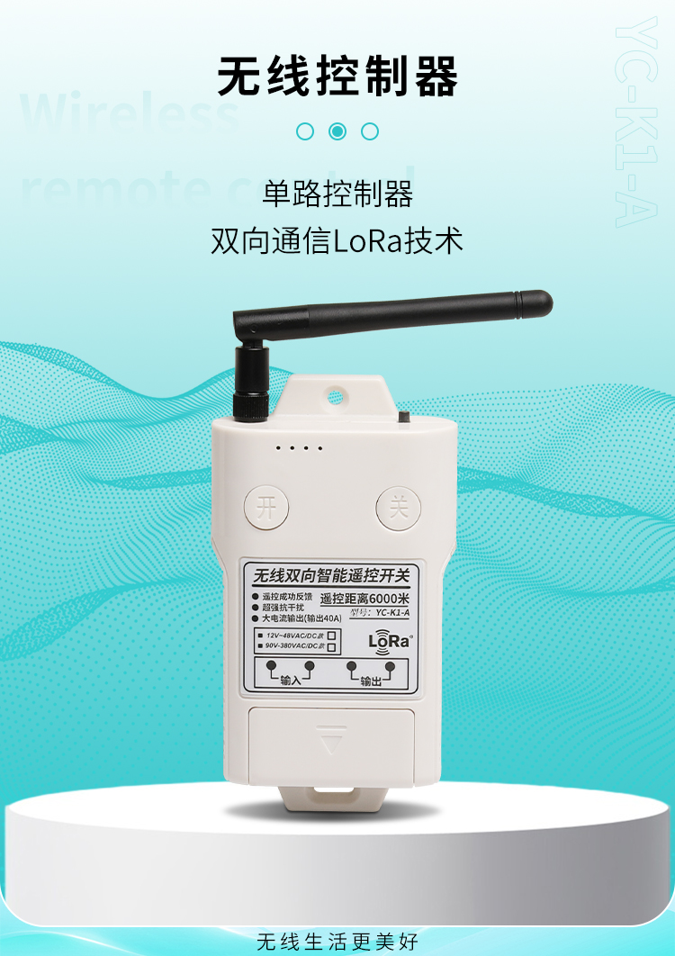 1. YC-K1-A接收器的輸入電源為AC(90V-380V)DC(12V-48V),可以滿足大多數客戶的不同電源電壓問題。2.本產品使用具有強大負載能力的大功率繼電器控製輸出(40A)。3.該控製器使用雙向通訊。4.從6公裏的距離可以清楚地知道信號的發送和接收狀態。5.該控製器采用LoRaSX1278丝瓜视频下载污雙向收發芯片設計,通訊距離更長,更穩定。