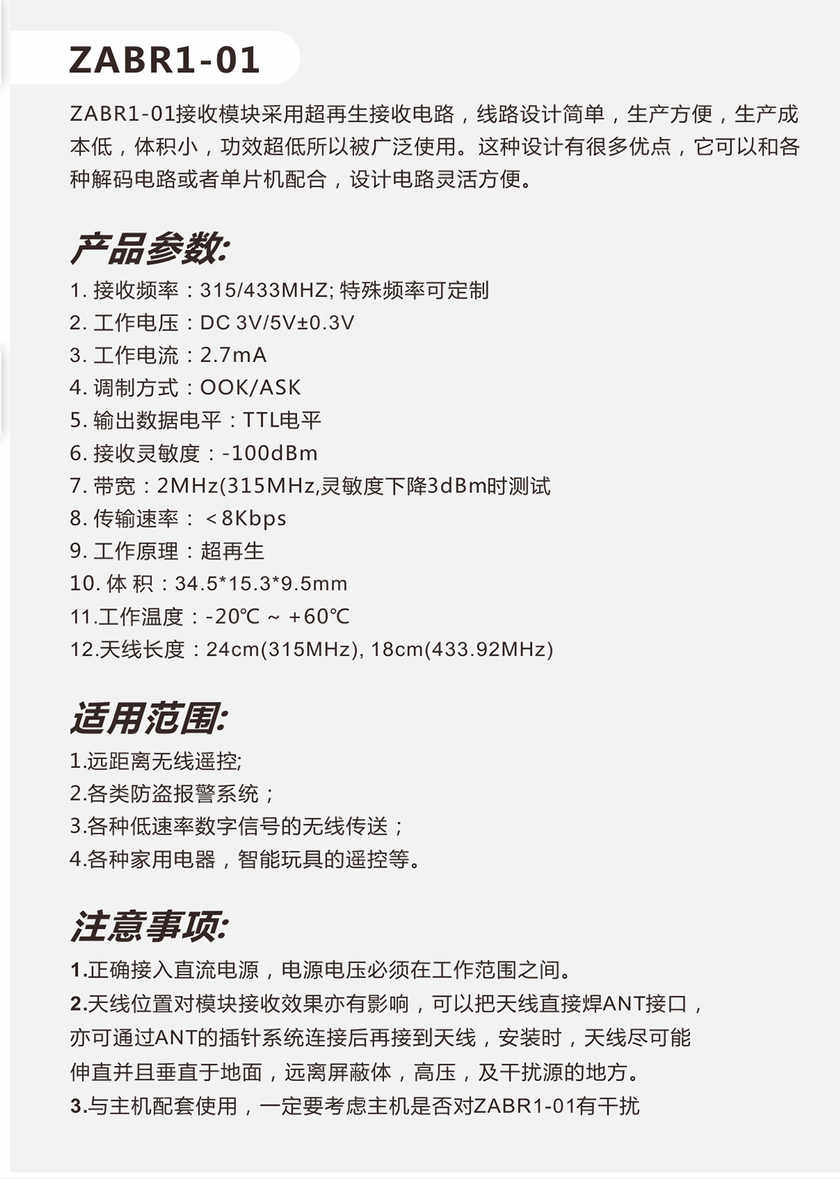 ZABR1-01接收模塊采用超再生接收電路,線路設計簡單,生產方便,生產成本低,體積小,功效超低所以被廣泛使用。這種設計有很多優點,它可以和各種解碼電路或者單片機配合,設計電路靈活方便。