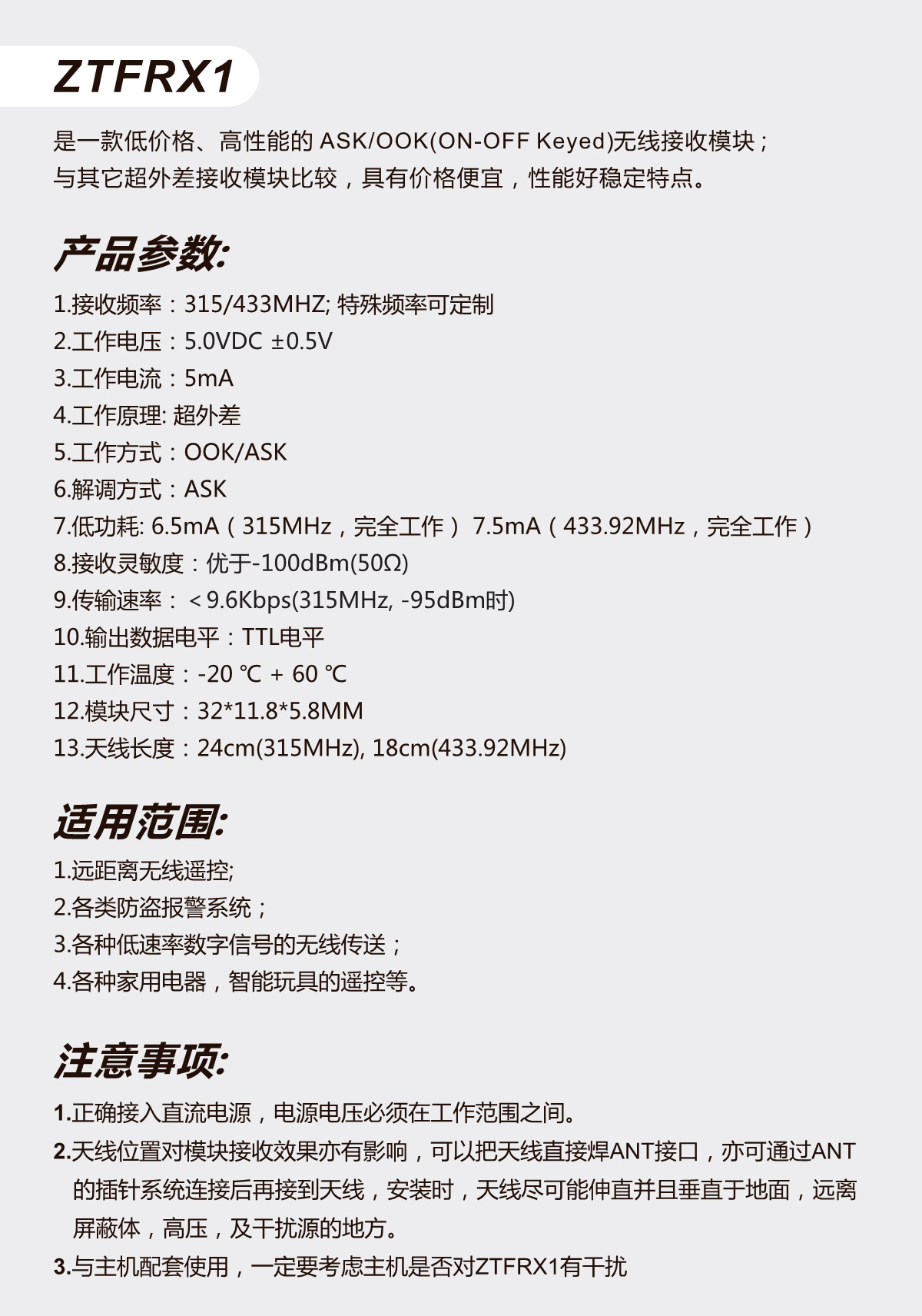 ZTFRX1是一款低價格、高性能的ASK/OOK(ON-OFF Keyed)丝瓜视频下载污接收模塊,與其他超外差接收模塊比較,具有價格便宜,性能好穩定特點。