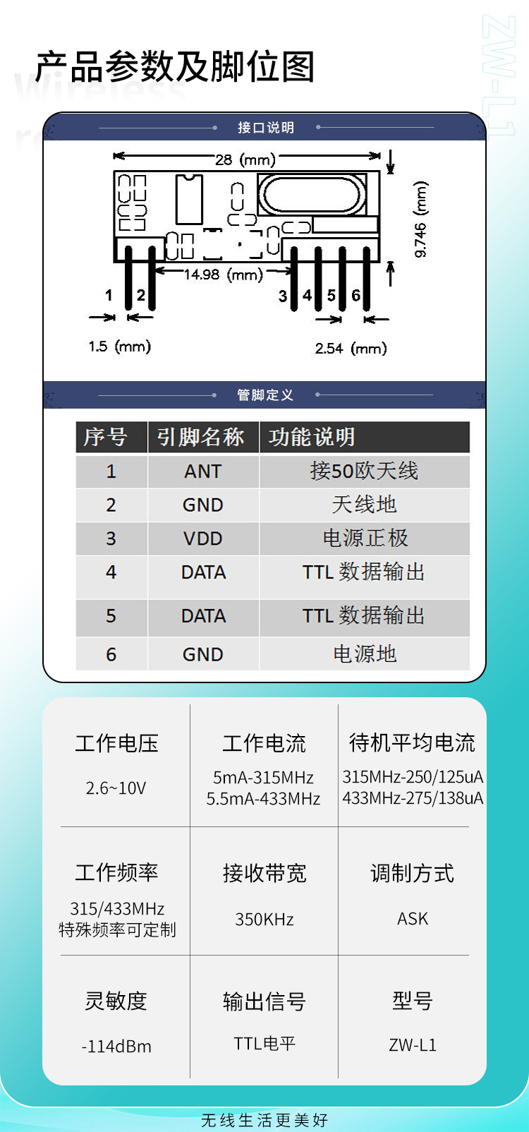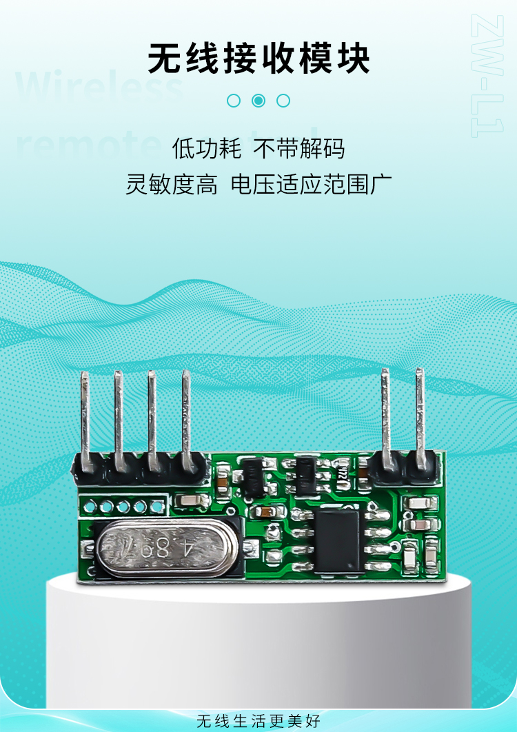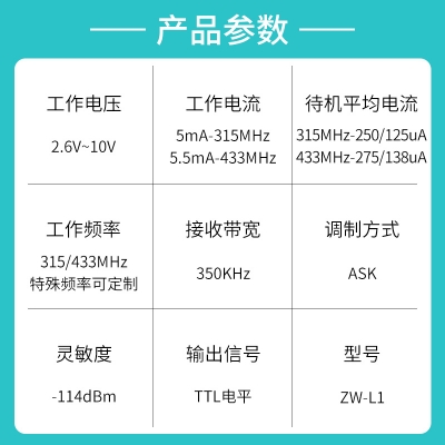 ZW-L1是一款高靈敏度、低功耗、不帶解碼的接收模塊,它工作電壓範圍廣