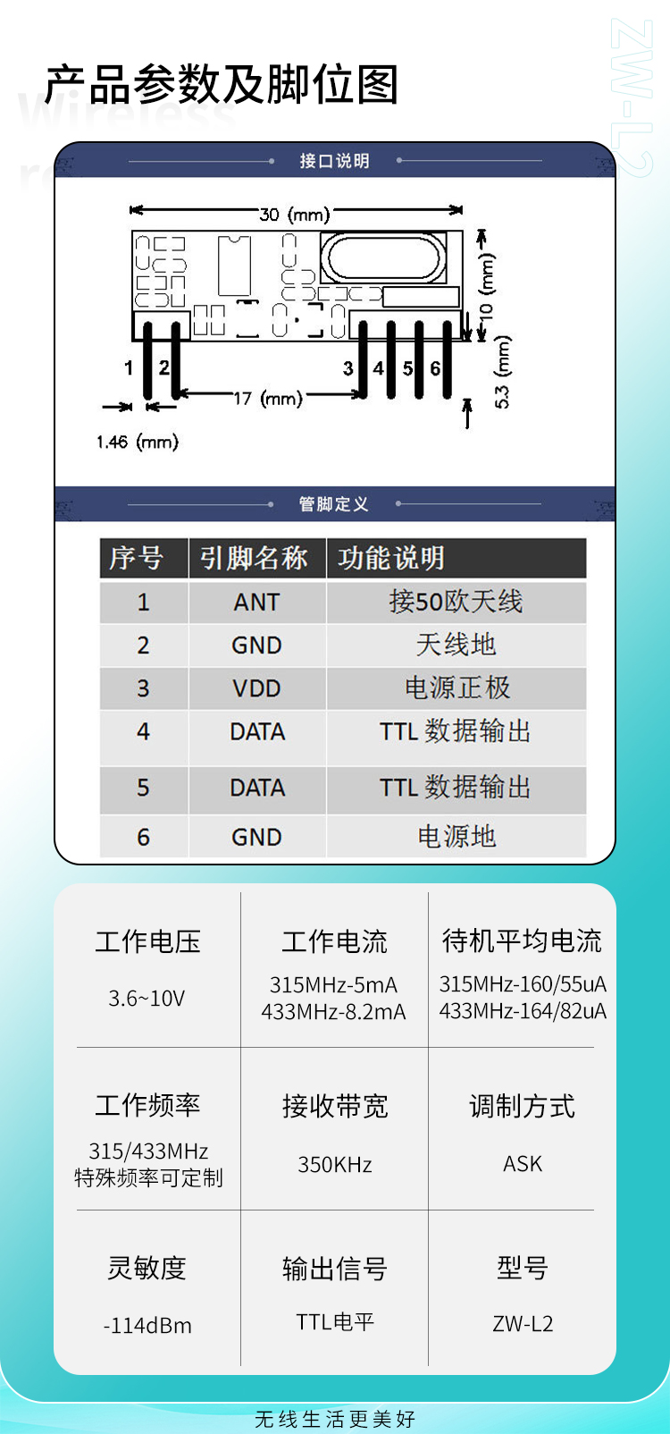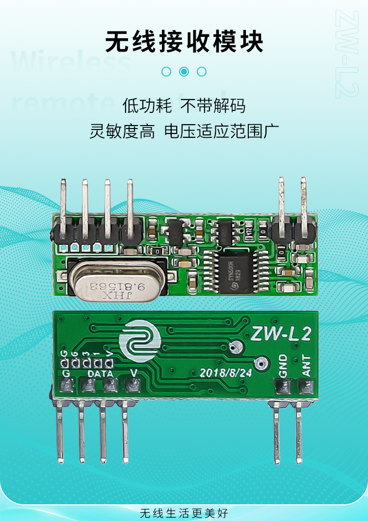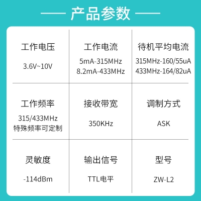 ZW-L2是一款高靈敏度、低功耗、不帶解碼的接收模塊,它工作電壓範圍廣