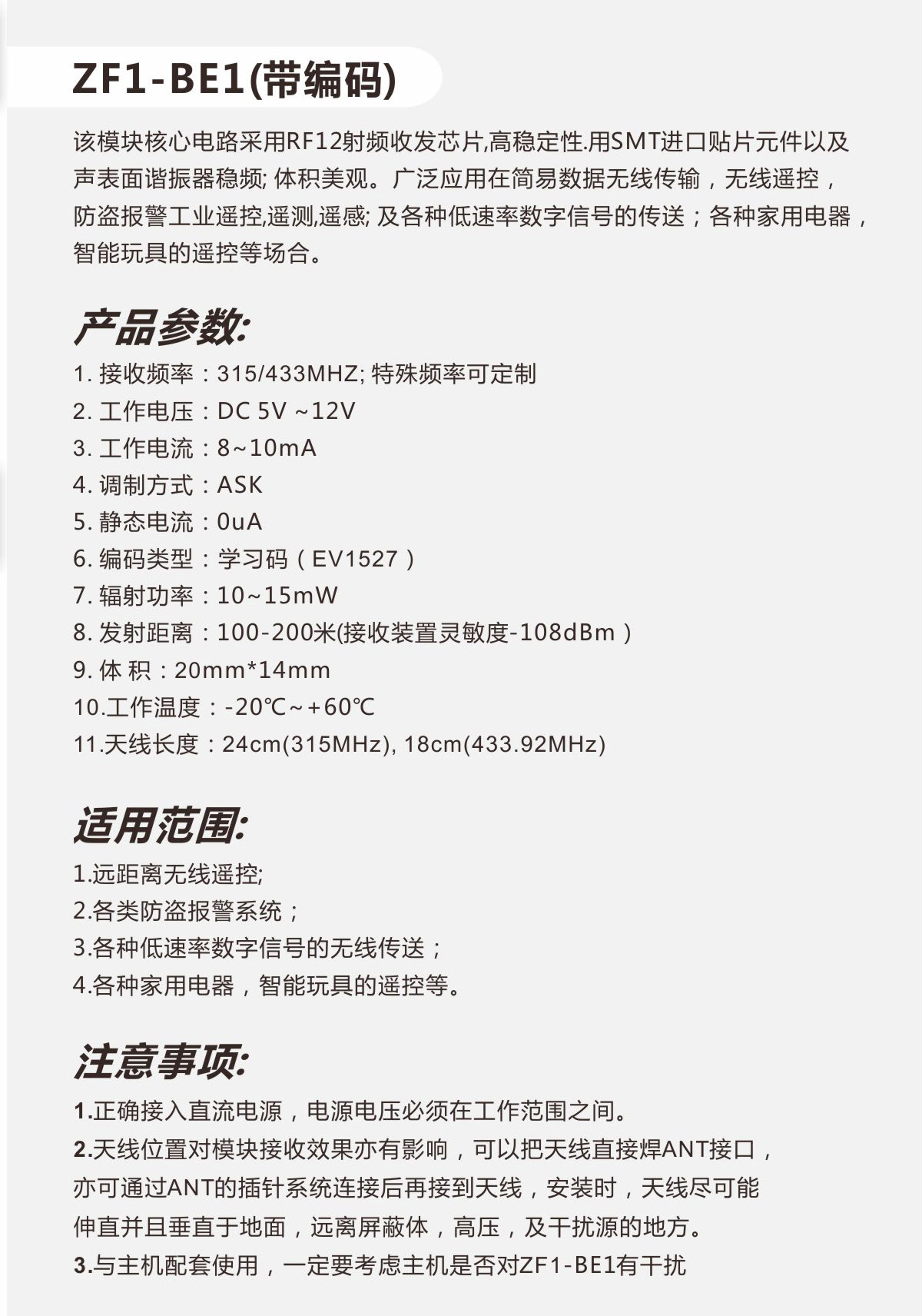 1.發射頻率:315MHZ /433.92MHZ