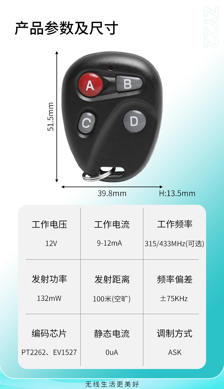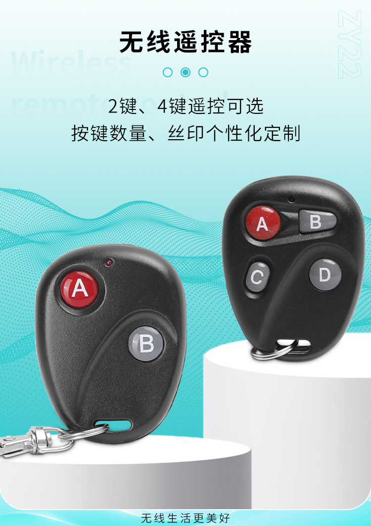 ZY22是一款小功率丝瓜视频下载污遙控器,2鍵4鍵可選擇,外觀小巧精致