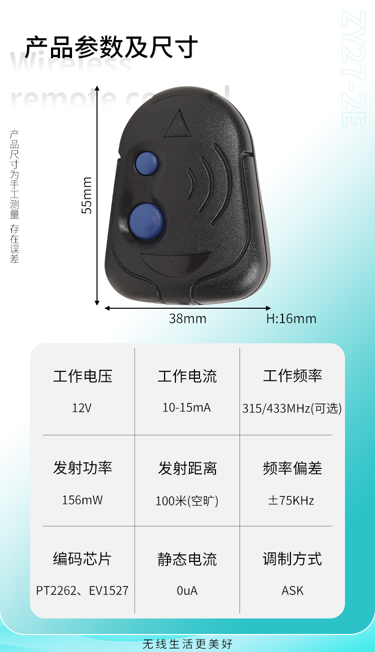 ZY27-2E是一款兩鍵小功率丝瓜视频下载污遙控器,外觀小巧精致