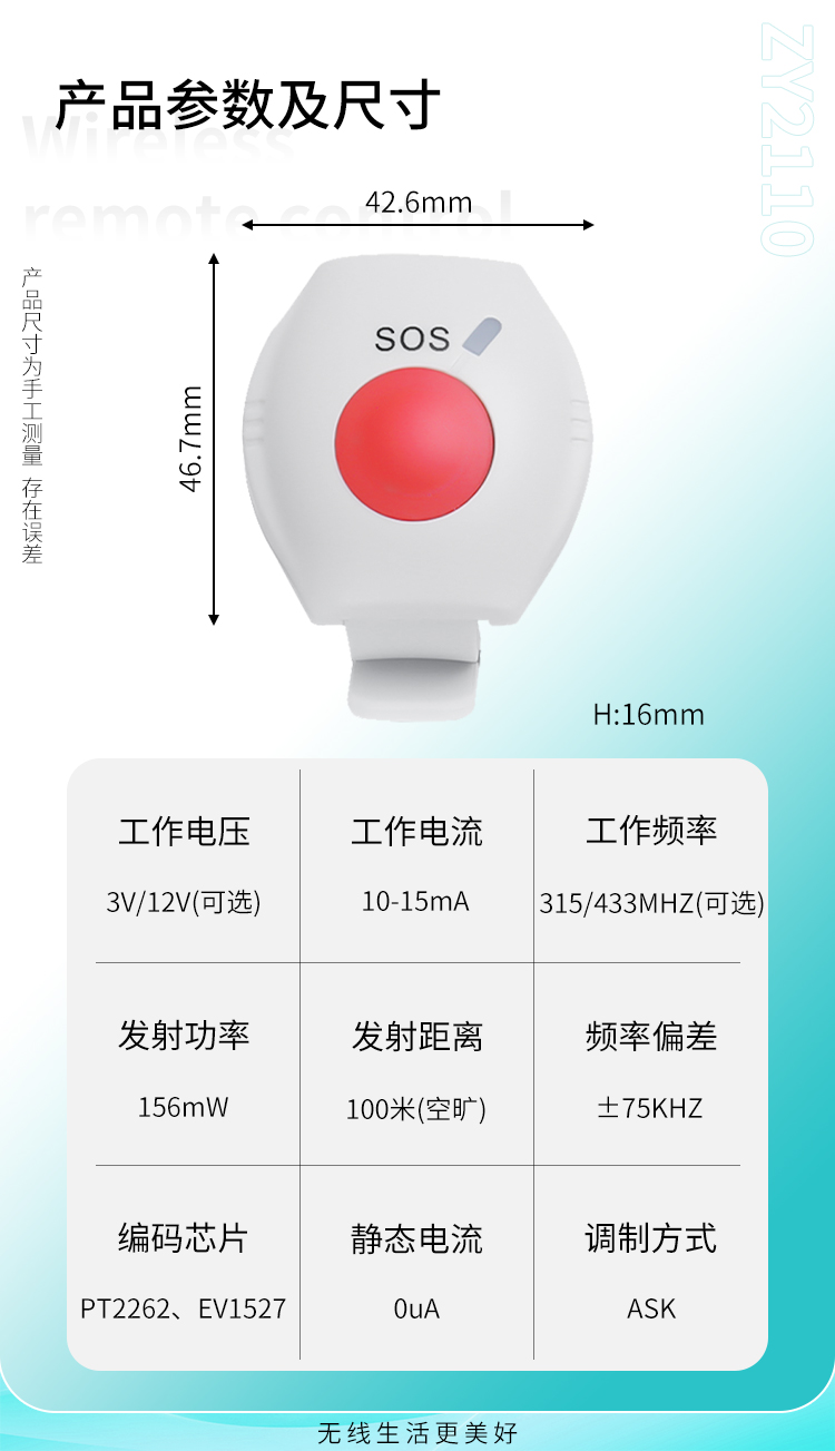 1、腕表式設計,攜帶和使用方便;2、按鍵延時觸發,避免誤報;3、功耗低,電池使用時間長。