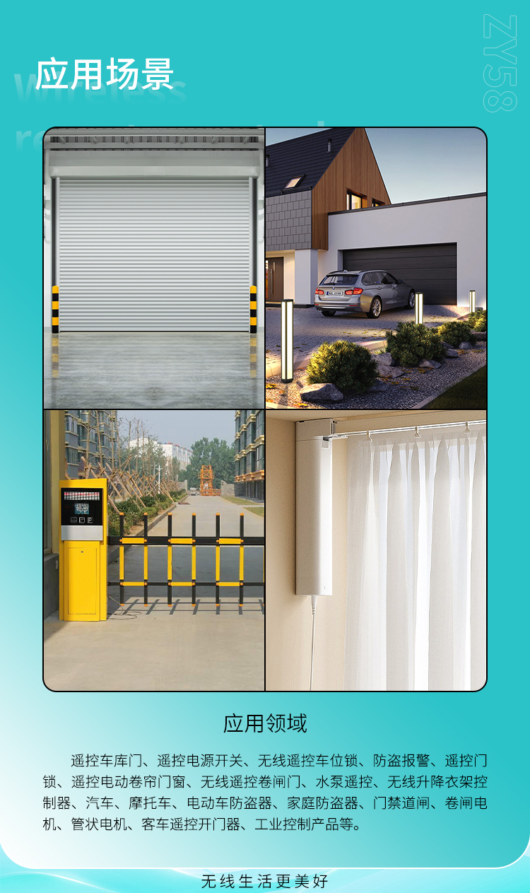 遙控車庫門、遙控電源開關、丝瓜视频下载污遙控車位鎖、遙控門鎖、遙控點動卷簾門窗、節能燈光、家庭防盜係統、工業或家庭遙控控製等。