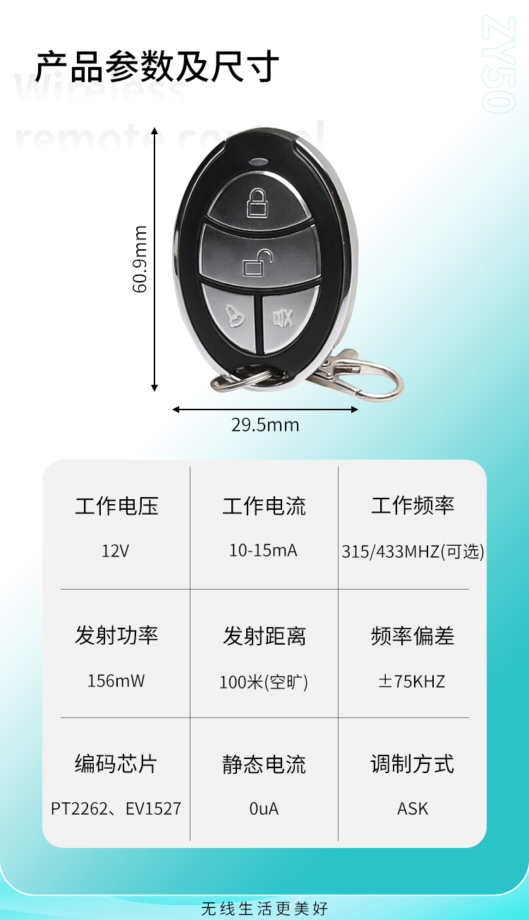 ZY50 小功率丝瓜视频下载污遙控器,具有可靠性高、頻率穩定、穿透能力強等特點;