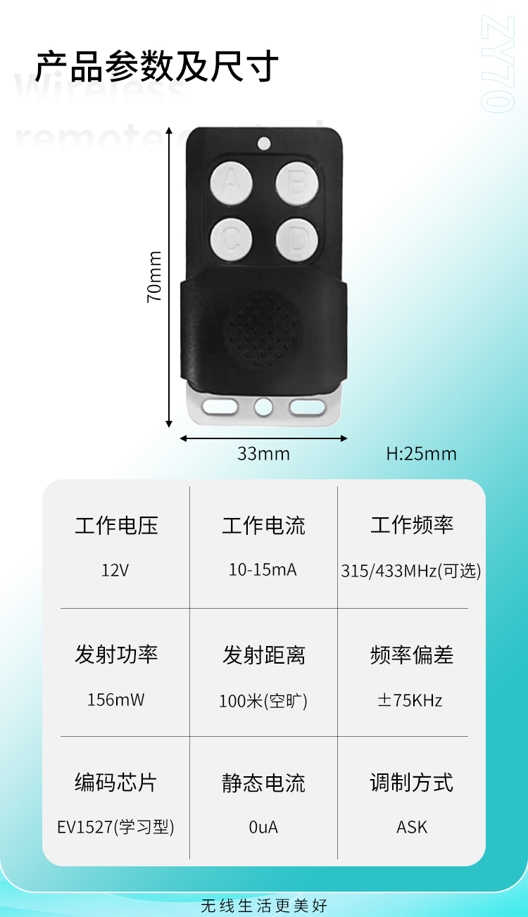 ZY70是一款小功率丝瓜视频下载污遙控器,具有可靠性高、頻率穩定、穿透能力強等特點;