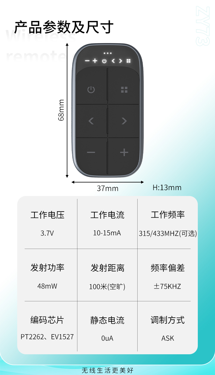 ZY73是我公司新開發的可充電的遙控器,TYPE-C接口,具有可靠性高、頻率穩定、穿透能力強等特點;