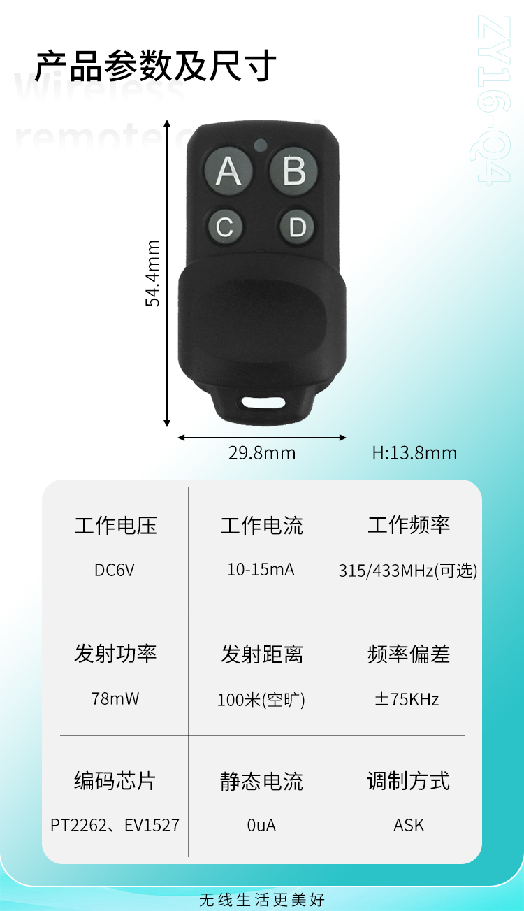 ZY16-Q4是一款小功率丝瓜视频下载污遙控器,具有可靠性高、頻率穩定、穿透能力強等特點;