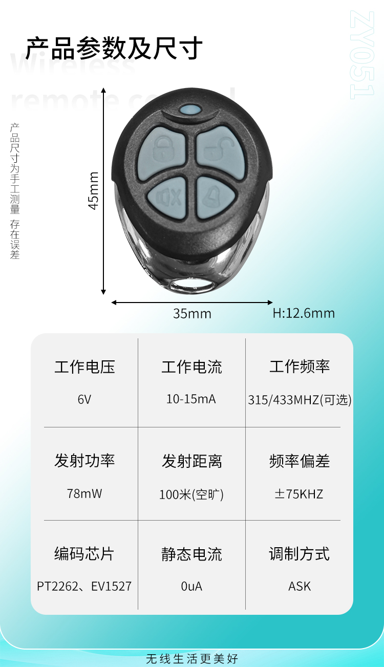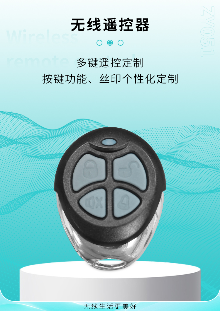 ZY051是一款小功率丝瓜视频下载污遙控器,金屬邊框,具有可靠性高、頻率穩定、穿透能力強等特點;