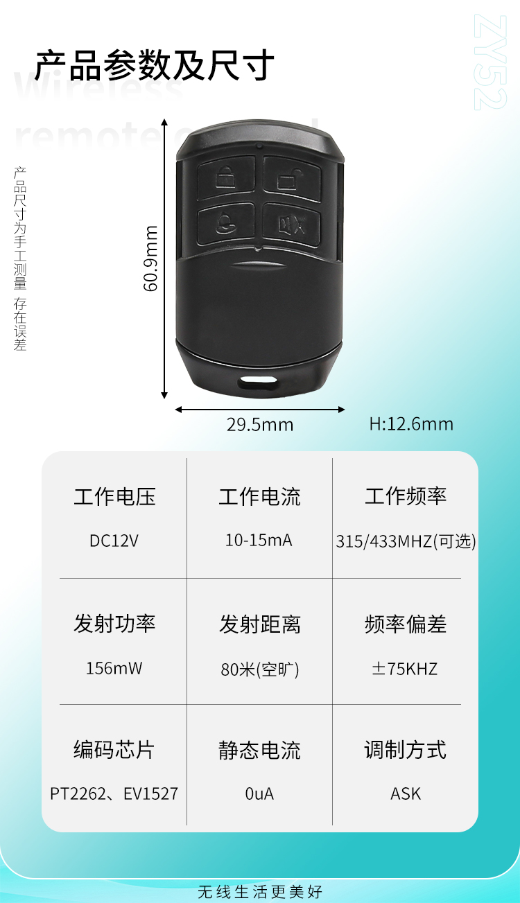 ZY52是一款小功率丝瓜视频下载污遙控器,具有可靠性高、頻率穩定、穿透能力強等特點;