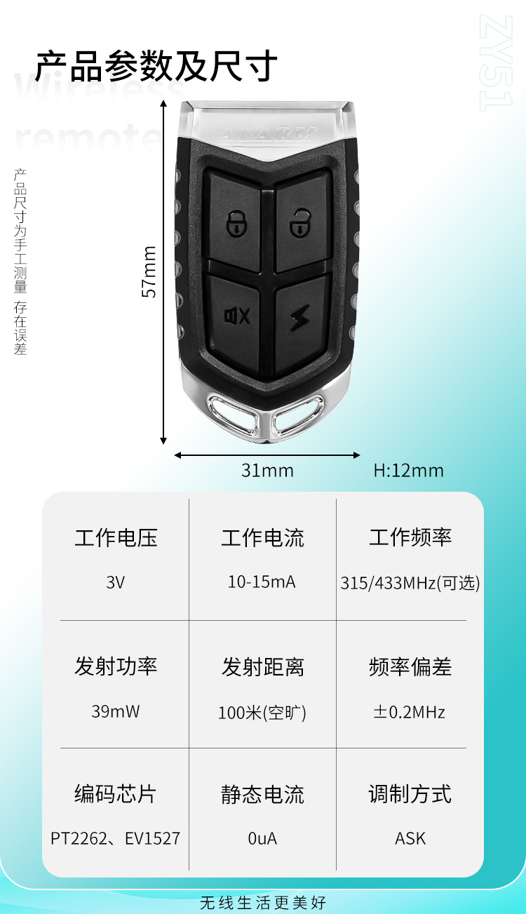 ZY51是一款小功率丝瓜视频下载污遙控器,外觀精致,具有可靠性高、頻率穩定、穿透能力強等特點;