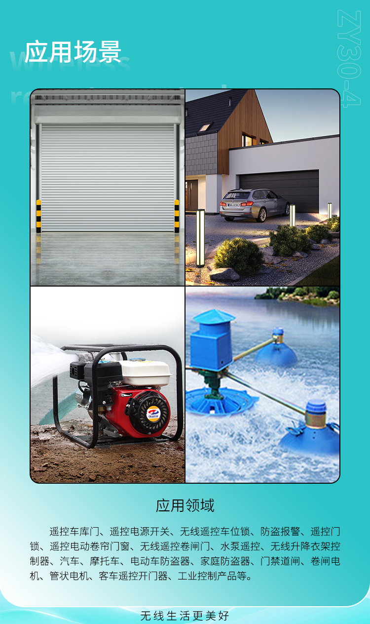 遙控開關、遙控車庫門、防盜報警、遙控門鎖、遙控電動卷簾門窗、水泵遙控、工業控製產品等;