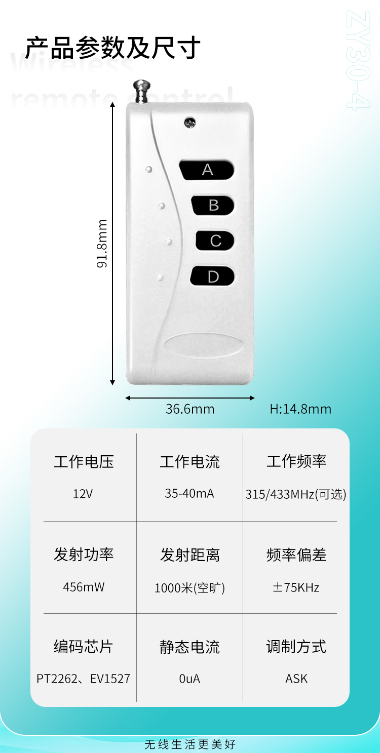 ZY30T-4是一款中功率丝瓜视频下载污遙控器,具有可靠性高、頻率穩定、穿透能力強等特點;