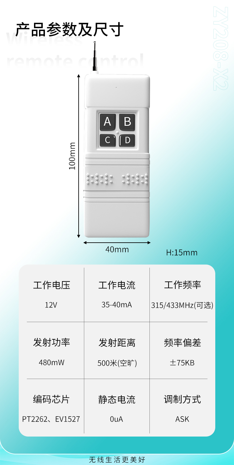 ZY208-X2是一款中功率遙控器,2鍵、3鍵、4鍵可選,外觀精美,質感好