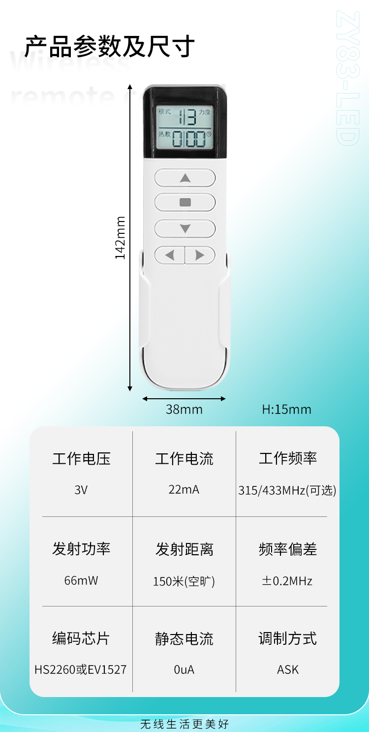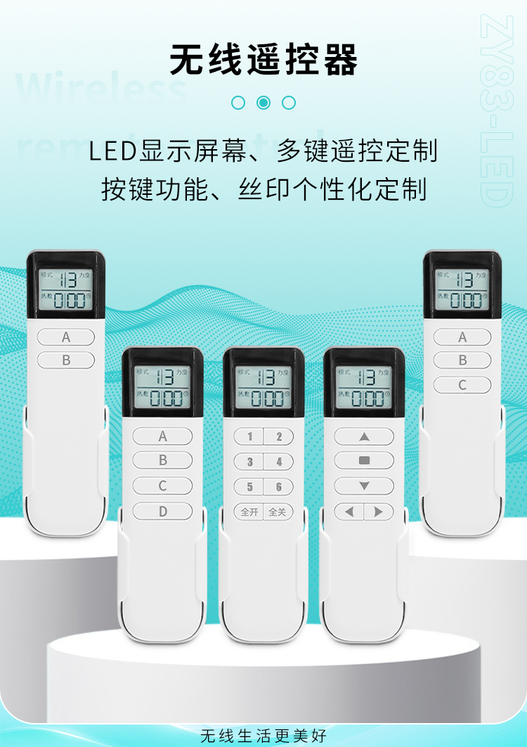 ZY83-LED是一款帶有LED屏的遙控器,外觀精美,多種按鍵可選,帶有底座,具有可靠性高、頻率穩定、穿透能力強等特點;